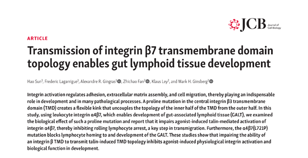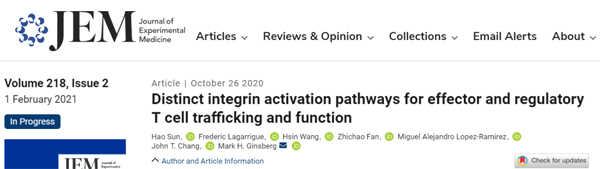 2020年10月27日,加州大學(xué)圣地亞哥分校醫(yī)學(xué)院,聯(lián)合法國圖盧茲大學(xué)和康涅狄格大學(xué)衛(wèi)生院的科學(xué)家在Journal of Experimental Medicine(JEM) 上在線發(fā)表了題為Distinct Integrin Activation Pathways for Effector and Regulatory T cell Trafficking and Function的工作(第一作者為孫昊博士)?! ?/p>